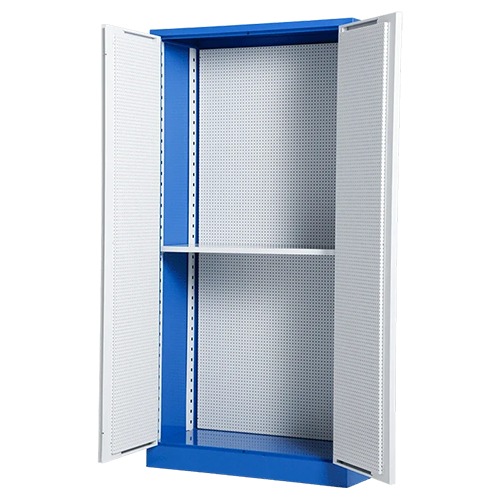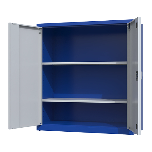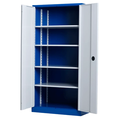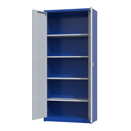 Deze kast met draaideuren is blauw gekleurd. De deuren kunnen in grijs, of zwart geleverd worden. De kast wordt geleverd inclusief 4 verstelbare legborden. Daardoor kan de hoogte van de vakken bepaald worden op basis van het voorwerp.