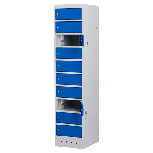 10 afzonderlijk afsluitbare lockers. Iedere locker heeft een eigen stopcontact. Daardoor kan tot 10 laptops of andere devices opgeladen worden.