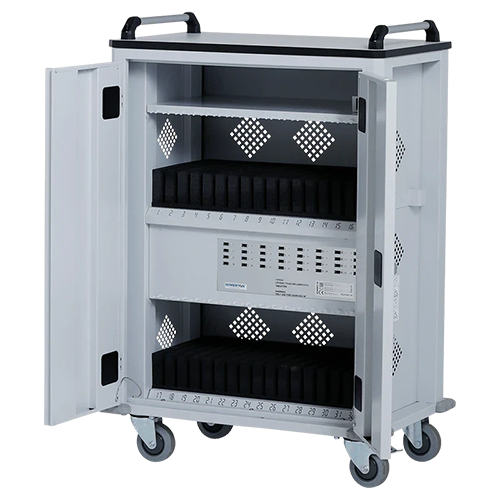 Kar met oplader voor 33 devices. De oplaadkar kan 32 tablets en 1 laptop tegelijk opladen.